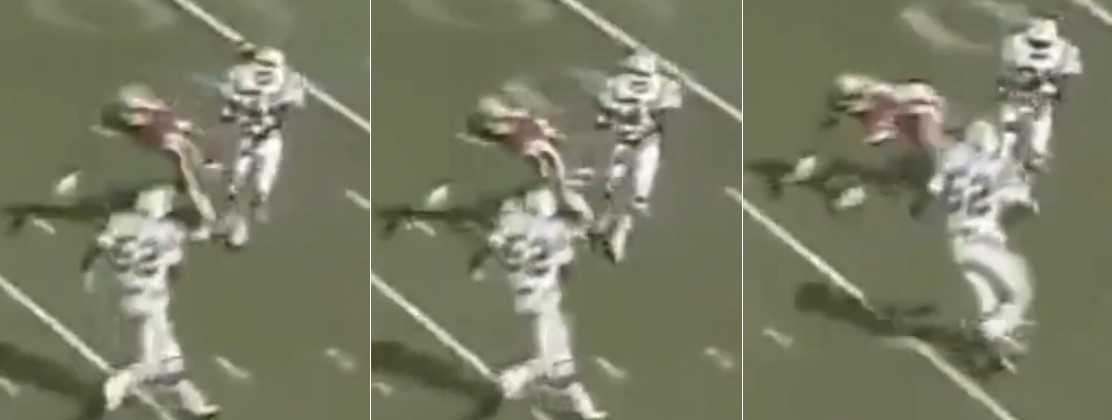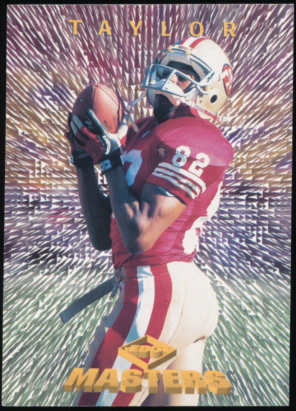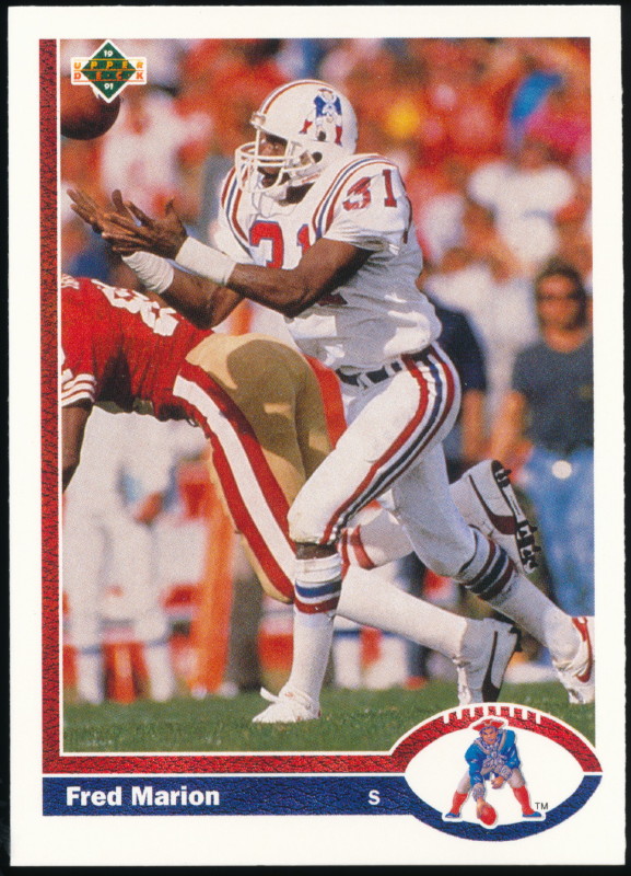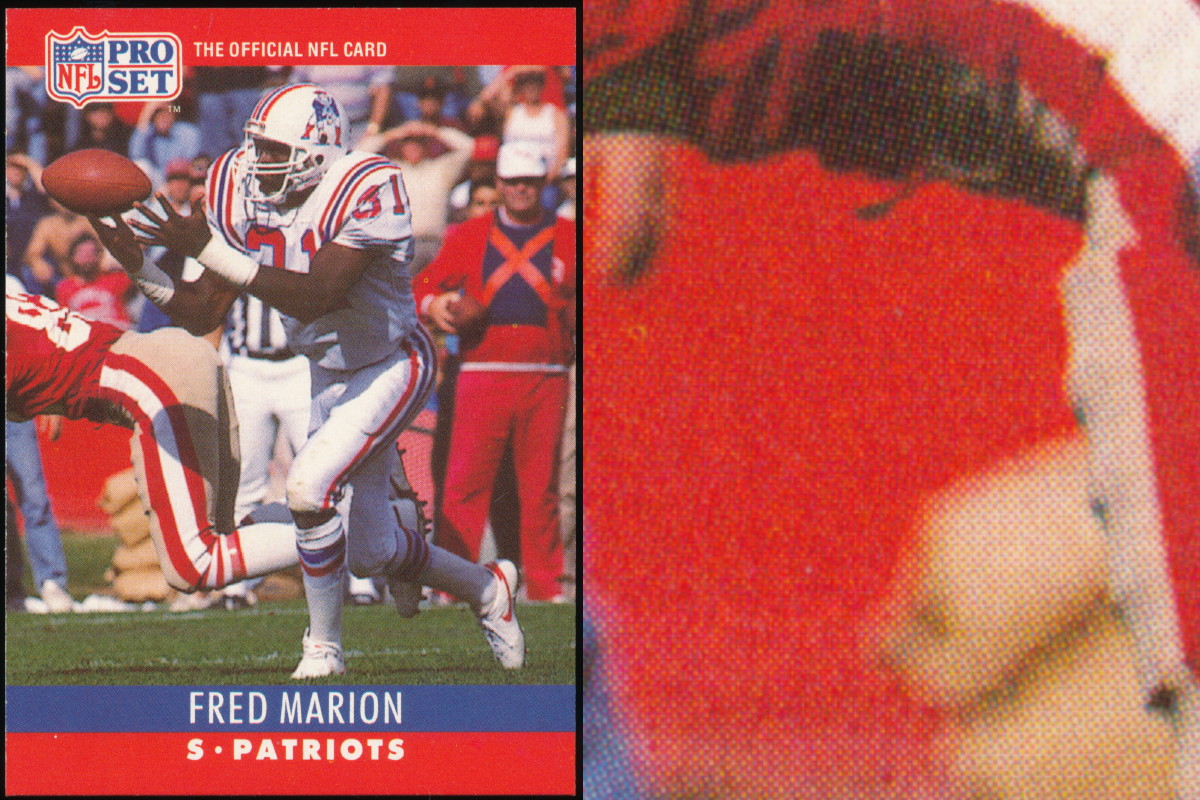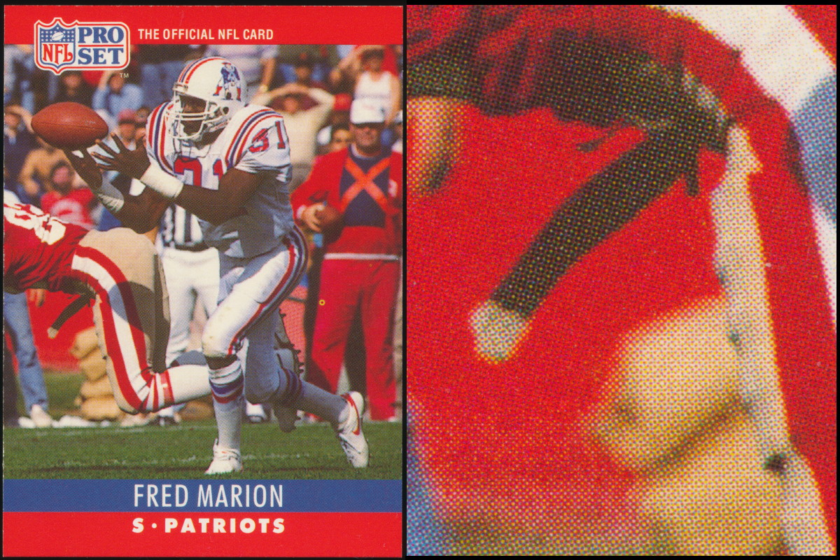 Two later issued cards appear to be linked to the '90 Pro Set addition. In 1991, Upper Deck made their Fred Marion card using an image from the same play. Just a slightly different angle. I think the belt is hidden by Taylor's body - rather than the picture being edited.