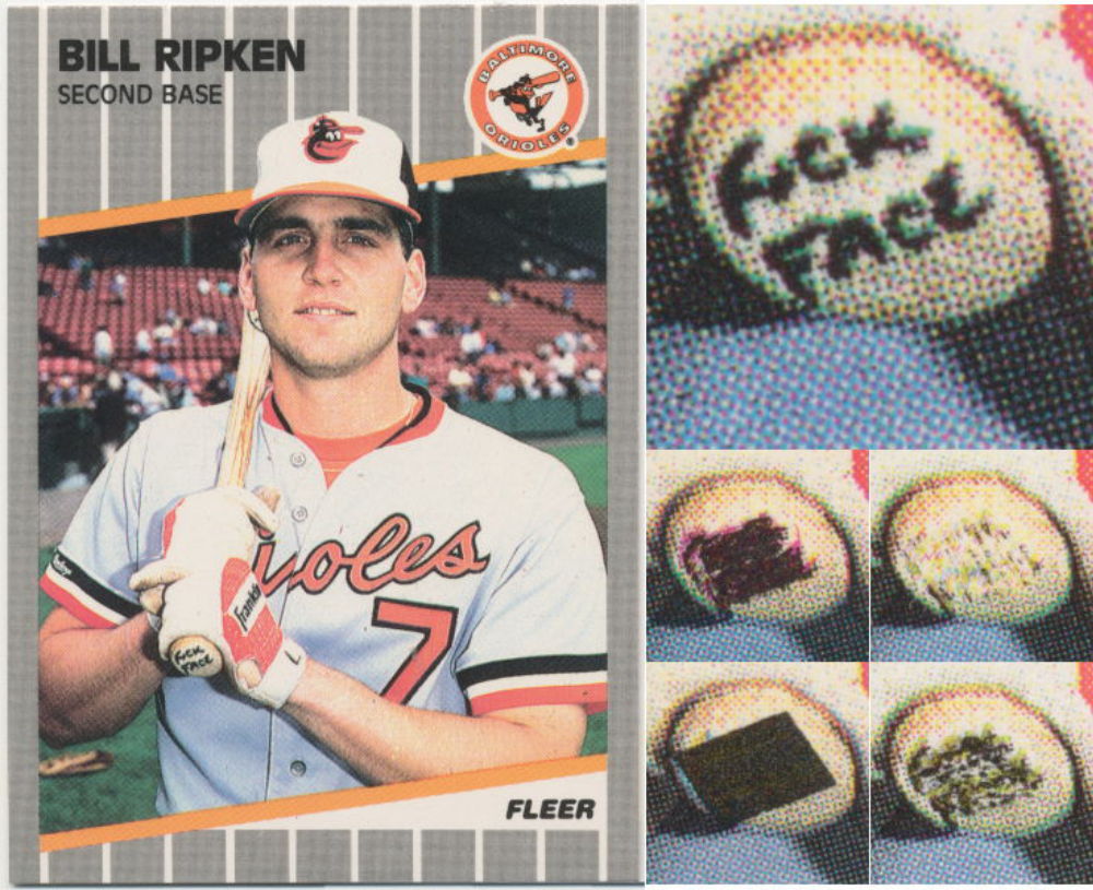 1989 Fleer #616: Fleer created a 660 baseball card set for 1989 and began production in late 1988. One card in particular slipped past the quality control and ended up in packs shipped all over the country. It took only a couple of weeks to turn a 5 cent common of Cal Ripken Jr's brother into a $50+ collectible. 'Someone' had written a bad word on the knob of a bat pictured on a card.