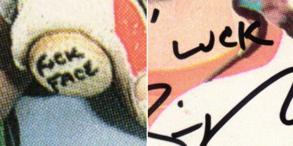 1989 Fleer #616: Fleer created a 660 baseball card set for 1989 and began production in late 1988. One card in particular slipped past the quality control and ended up in packs shipped all over the country. It took only a couple of weeks to turn a 5 cent common of Cal Ripken Jr's brother into a $50+ collectible. 'Someone' had written a bad word on the knob of a bat pictured on a card.